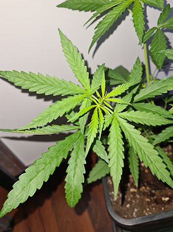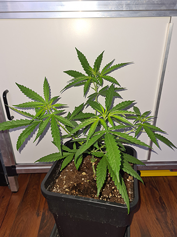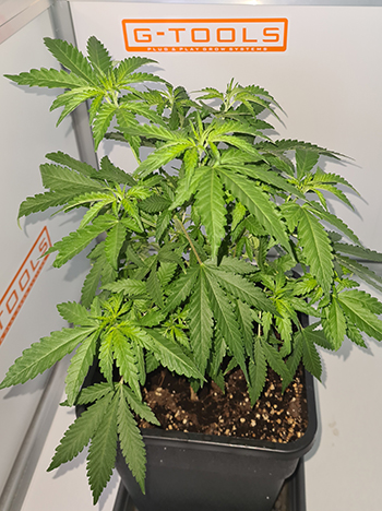 De eerste Mohammed (hieronder) die we bekijken is één van de twee oudere en grotere planten. Deze staat er goed voor, met een hoogte van 34 centimeter. Ze krijgt ondertussen 950 milliliter water met voeding per dag. Hiervoor houd ik week 2 van het voedingsschema van Plagron aan.