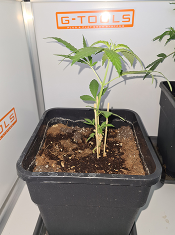 De derde plant waar we het over hebben is de eerste van de later ontkiemde Mohammed zaden. Die hebben net hun vierde week in de kweekkast doorgemaakt. Ze heeft een hoogte van 31 centimeter en krijgt per dag 400 milliliter water met voeding. Ook deze plant is mooi groen. Vergeleken de oudere dames zijn de nieuwe Mohammeds nog wel wat aan de slanke kant, zoals je hieronder kunt zien.