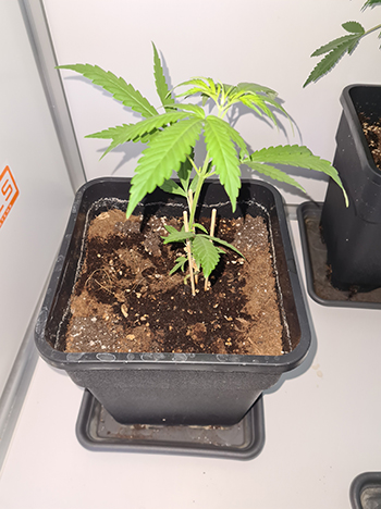 De vierde dame is dan natuurlijk de tweede van de nieuwkomers. Dit was vorige week nog een kleine plantje die moeite had om rechtop te blijven staan. Maar kijk haar nu eens trots staan. Ze is met 25 centimeter nog steeds de kleinste maar doet haar uiterste best om mee te komen. Ze drinkt 350 milliliter water met voeding per dag maar ik ben bang dat dat te veel is. Tijdens de fotosessie til ik de planten altijd even van hun plek en dit was de zwaarste pot. Dat wijst erop dat ik de dame aan het overbewateren ben, aangezien ze de kleinste is. Ik zal haar de komende week even extra in de gaten houden, en zorgen dat ze wel alles opdrinkt voor ze nieuw water krijgt.
