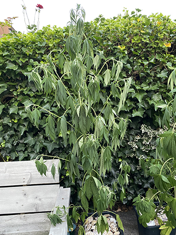 Update 28 juli 2022: Ja, dat ff in de zon liggen is niet altijd goed voor de plantjes, zie deze bijdrage. Nr. #4 en #5 (op de foto) hebben veel blad dus daar was het gemis aan vocht het meest te zien. Een aantal dagen veel zon en geen aandacht door de verzorger is niet goed. Heb nu een druppelsysteem aangelegd voor nummer #5. Maar even kijken of dat helpt.