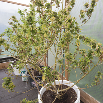 Helaas vertoonde de Black (Domina) Afghani Kush wel enkele tekens van stamrot. De genen van de domina zouden volgens horen zeggen sterk bestendig tegen ziektes en rot moeten zijn. Echter bleek vorig jaar dat de domina als eerst aangetast was. Zonde van zo’n mooie strain. Dit jaar echter blijkt de Afghani van alle dames het minste rot te vertonen. Slechts 5 grammen vermoeden wij verloren te hebben aan deze aandoening, wat haar resistentie toch nog eer aan doet!