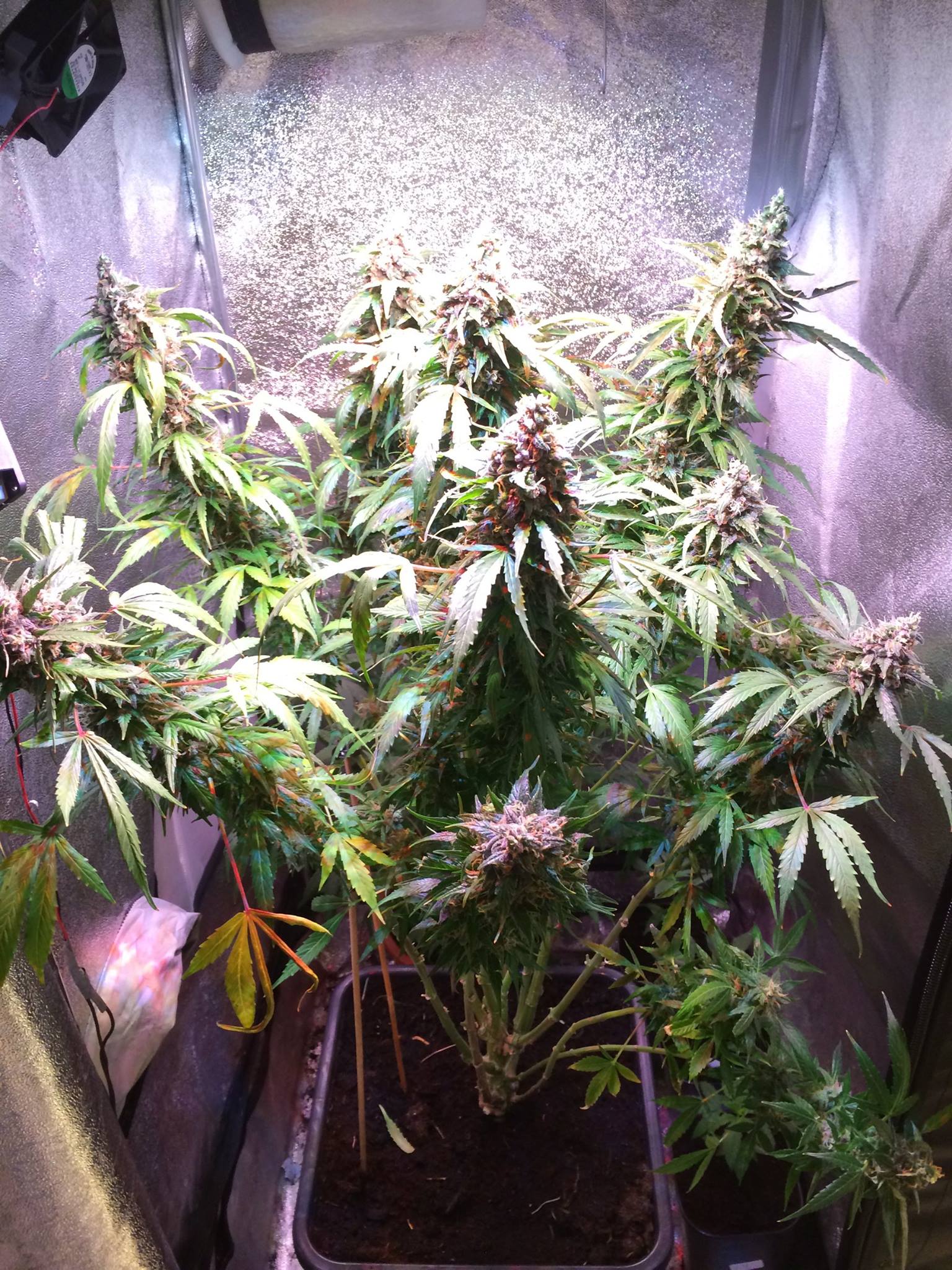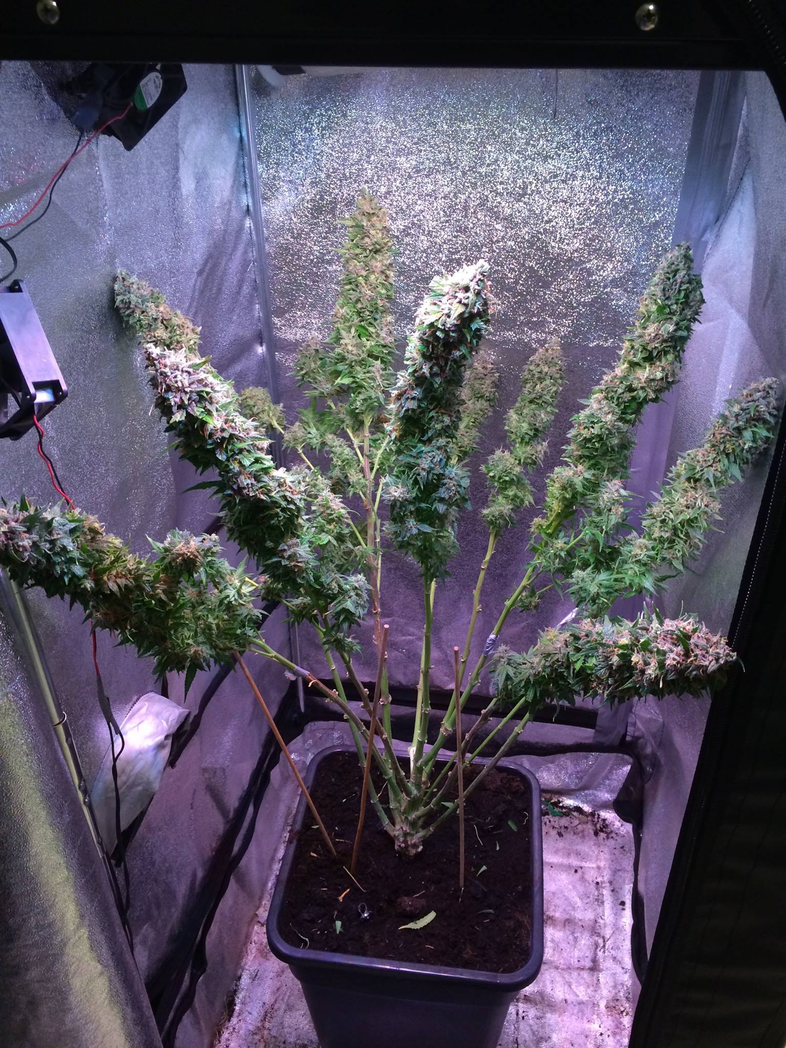 Jawel lieve RollingStoned lezers, eindelijk komt er dan een einde aan mijn eerste LED-test! Na 18 weken is dan ook de laatste van de Jack Herer Autoflowering planten van Zambeza Seeds omgehaald. De plant heeft een prachtige structuur gekregen. Na het fimmen groeide ze de afgelopen maanden uit tot een plant met 12 dikke cola’s van toppen. En daarmee heeft deze LED-lamp zich wat mij betreft wel bewezen. De Horticoled X-Max V2 hing bij mij in een tentje van slechts 60 x 60 centimeter maar zou nog beter tot zijn recht komen in iets grotere ruimtes tot zeg 1,2 bij 1,2 meter. Dat deze lamp goed te gebruiken is om onder af te bloeien daar is geen twijfel over, kijk zelf maar.