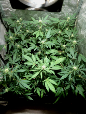 Zoals jullie kunnen zien is mijn kweektentje, die overigens een oppervlakte heeft van 60 x 60 centimeter, na de groeispurt van de afgelopen weken flink vol gegroeid. En dat komt goed uit, want de groei is nu ondertussen wel uit de planten. De topjes, die eerder nog enkel maar wat haartjes waren, beginnen zich nu mooi af te tekenen en vormen zich al tot kleine knikkertjes van topjes. Er zitten er lekker veel in de tent dus dat voorspelt een mooie oogst voor deze ronde!