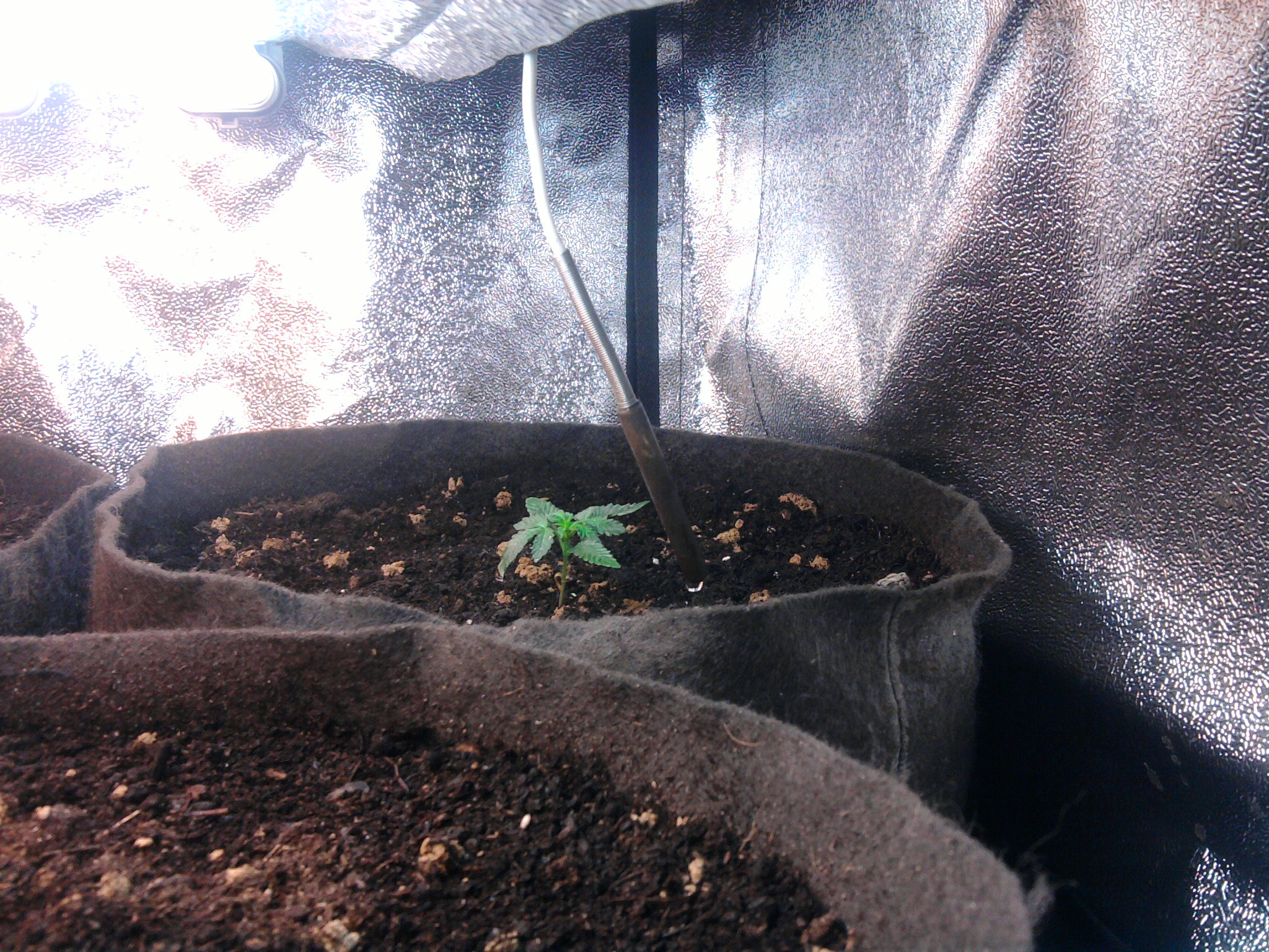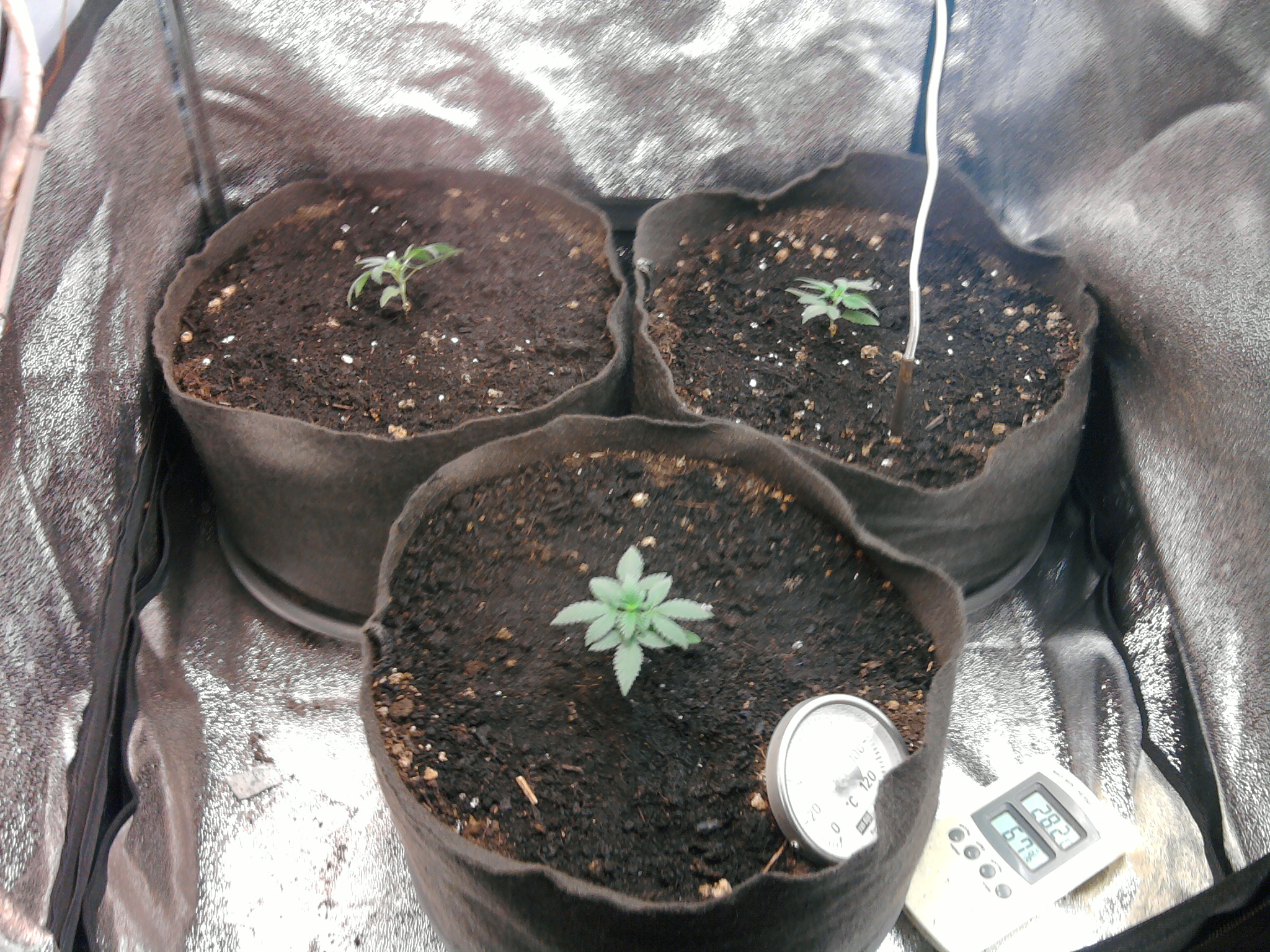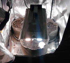 Op de foto’s zie je een draadje hangen, dat is een temperatuursensor uit een koelcel. Zo kan ik de temperatuur op verschillende plekken in het tentje meten. Zoals je ziet is de temperatuur in de tent nu een graadje of 24, wat prima is wat mij betreft.