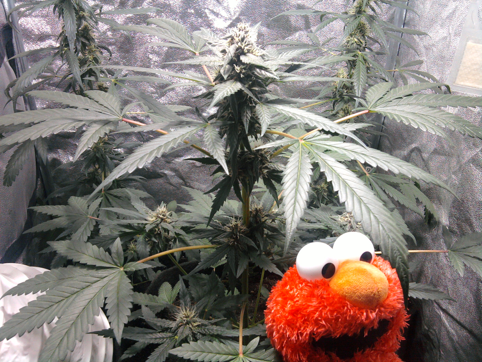 In de kleine kweektent van Elmo staan nu al zes weken 3 prachtige KillingKush planten te groeien en vooral ook te bloeien. Met dat laatste zijn ze nu aan week nummer vier bezig en Elmo is blij. Nou kijkt Elmo altijd blij, maar het lijkt erop dat hij daar nu wederom drie goede redenen voor heeft.