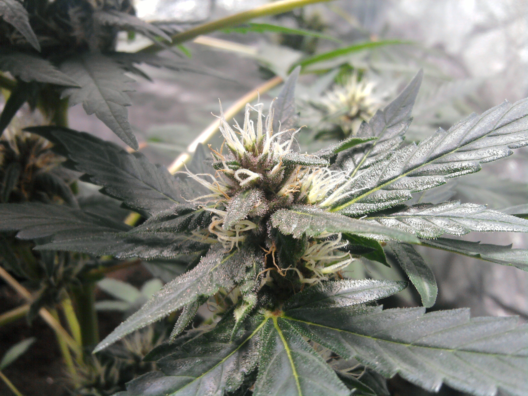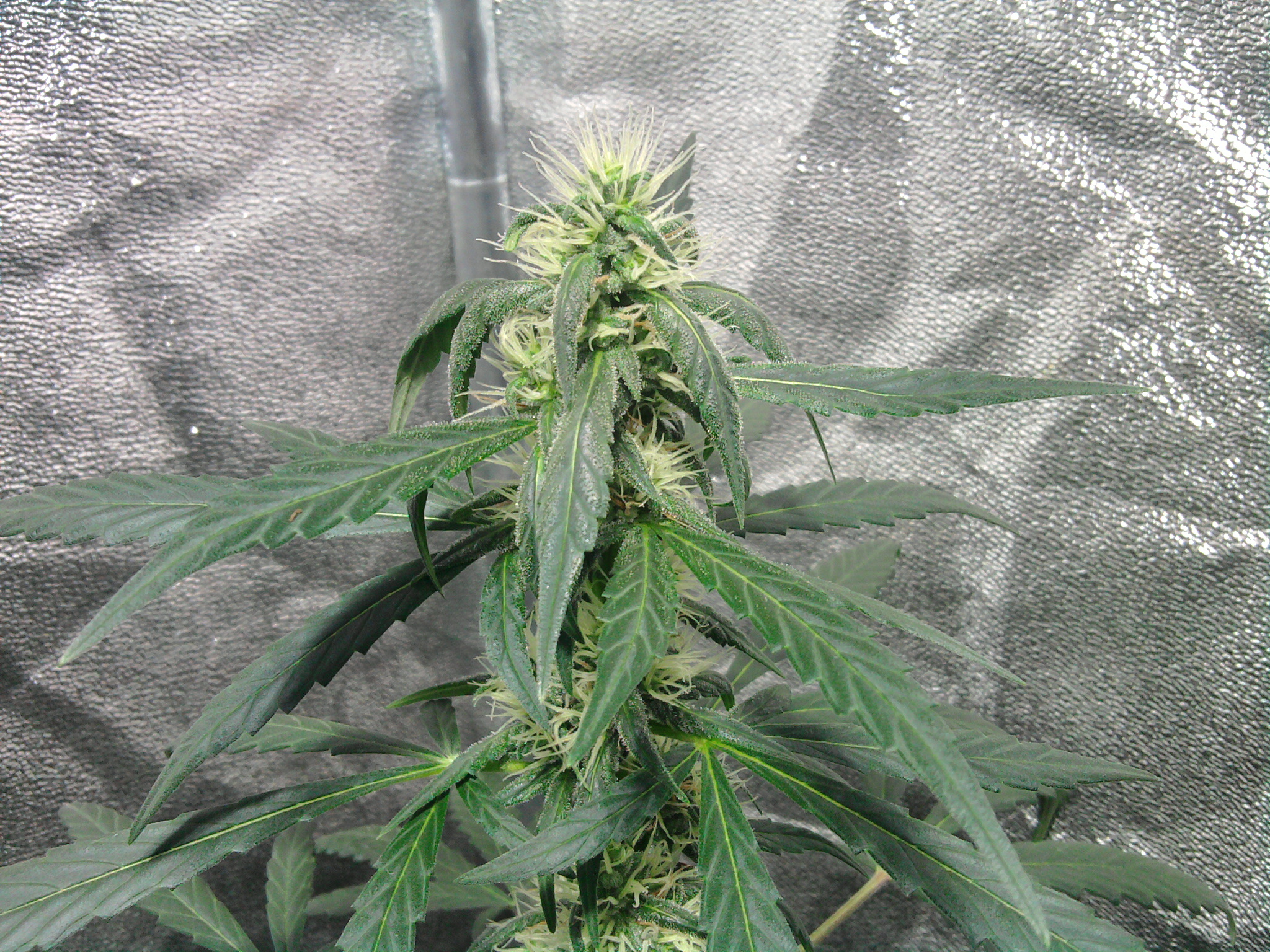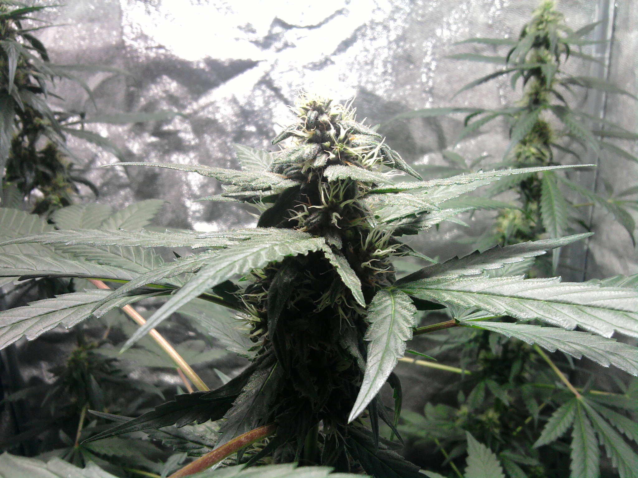 De 3 KillingKush planten in m’n compleet ingerichte tentje, daar gaat het natuurlijk om. Ik heb voor de gelegenheid en voor de mooiere kleurechte foto’s de metal halide lamp er vandaag weer even ingedaan. De planten zijn vanaf het ontkiemen deze week 6 weken oud, en vandaag begint de 4e bloeiweek. We hebben dus 3 bloeiweken achter de rug. De planten zijn niet erg veel meer in de hoogte gegeroeid, maar de toppen daarentegen beginnen zich aardig te vormen, en vooral heel lekker te vullen!