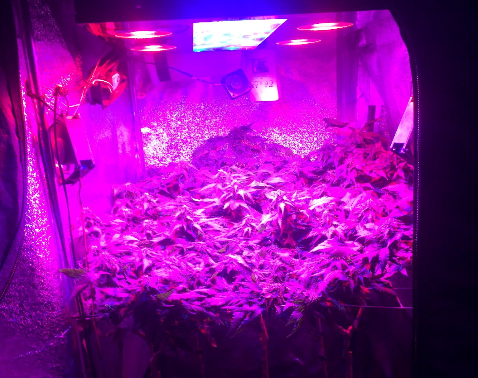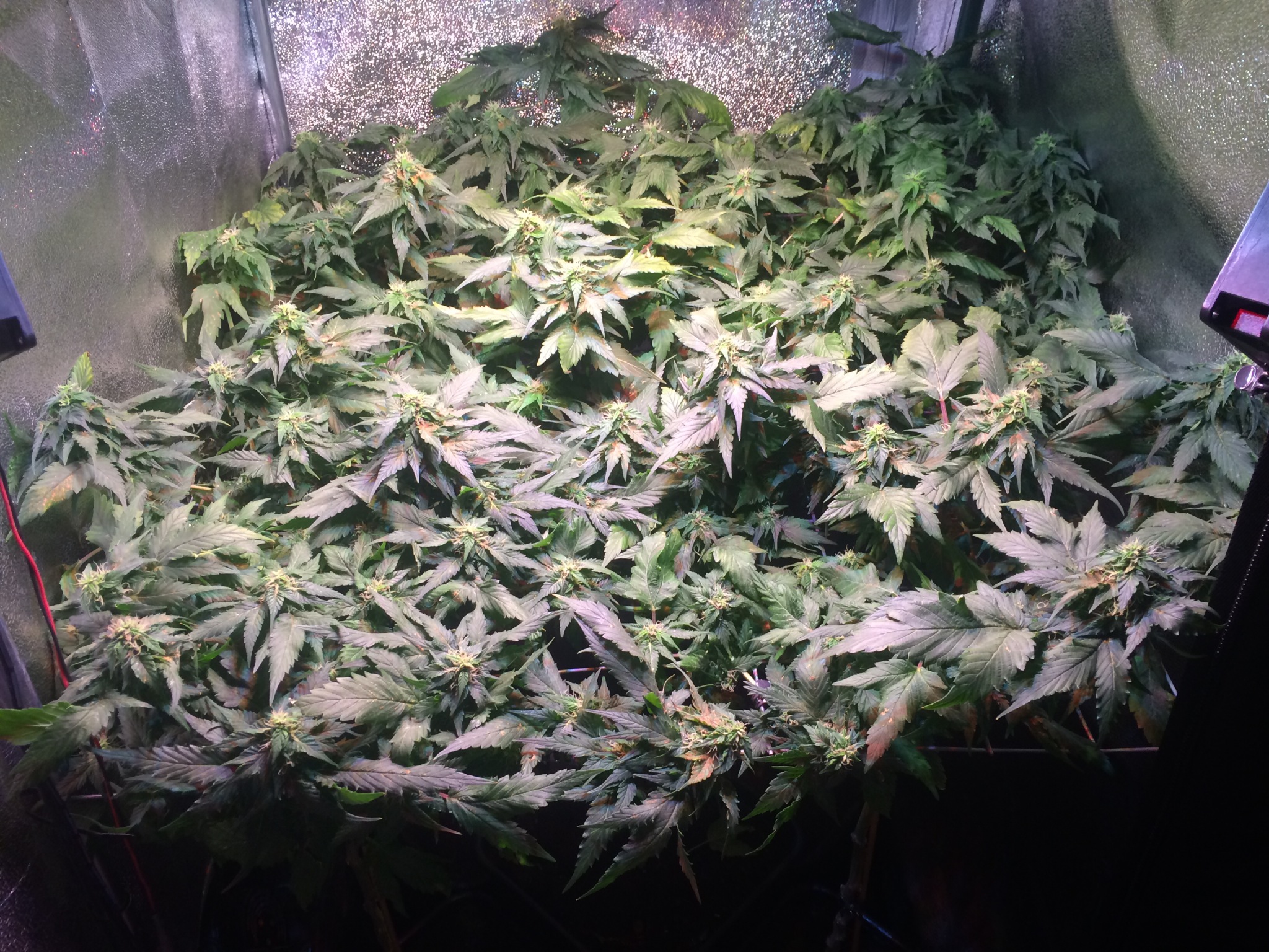 Onder de Horticoled kweeklamp van Elmo bloeien inmiddels al weer zes weken vijf Duckfoot planten en de kleine kweektent begint behoorlijk vol te raken. Zo vol dat Elmo twee weken geleden al een scrogrek moest aanbrengen.