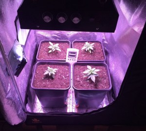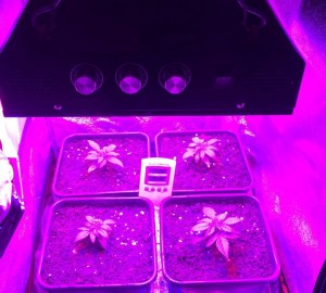 De planten groeien supersnel onder de LED, zelfs sneller dan ik van mijn 150 Watt HPS lamp gewend ben. De volgende foto’s zijn gemaakt op dag nummer 19 vanaf zaadje. Ik moest het vermogen van de lamp wel even dimmen voor ik de foto’s kon maken, want mijn camera trok het niet helemaal, zoveel licht.