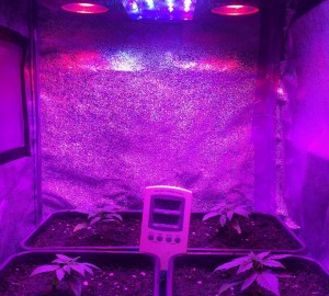 Vorige week heb ik jullie uitgelegd hoe je het kleurenspectrum bij deze lamp helemaal naar je eigen hand kunt zetten. Er zitten drie draaiknoppen op voor de verschillende leds, B, R en W. Knop B is voor het blauwe licht, knop R voor het rode en knop W is voor het witte licht, de aanvullende kleuren en UV licht. Vorige week heb ik het blauwe en rode licht dagelijks opgeschroefd. Inmiddels zijn de plantjes dusdanig sterk ontwikkeld dat ik alle drie de knoppen op hun volle vermogen heb aangezet, we gaan knallen met de volledige 350 Watt die deze lamp in zich heeft!