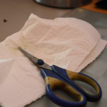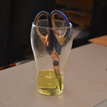 Ik gebruik trouwens ook olijfolie om de scharen na het knippen schoon te maken. Zet de schaar in een glas en laat het een uurtje staan. Daarna kun je ze gemakkelijk schoonvegen met een stuk keukenpapier. De olijfolie kun je zelfs nog gebruiken om mee te koken, als je er heel veel scharen mee hebt schoongemaakt zou het zelfs voor medicinale wietolie kunnen doorgaan, haha.