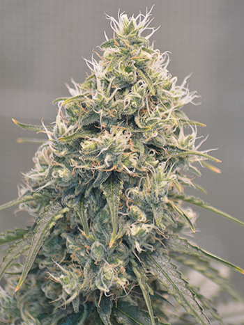 Ik pak dan één voor één steeds een tak bij de steel vast en begin dan langs de top te knippen. Let op dat je de top zelf daarbij niet raakt. Door de steel tussen duim en wijsvinger te houden, kun je hem tijdens het knippen gemakkelijk draaien. Ik knip voornamelijk de grote schutbladeren van de top. De suikerblaadjes laat ik zitten want die rook ik gewoon op. Ik weet dat niet iedereen dat lekker vind, maar ik kan iedere trichoom gebruiken en heb er geen probleem mee. Ons bin zunig.