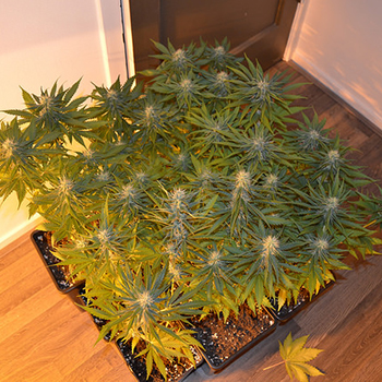 Afgelopen week was bloeiweek nummer vier. De toppen worden nu elke dag een beetje dikker en zwaarder en zijn ook volop begonnen met het produceren van trichomen. Waren het vorige week nog beginnende harige bolletjes, deze week zijn het zonder twijfel echte toppen geworden. Omdat de foto’s onder de 150 Watt HPS kweeklamp al snel overbelicht worden, heb ik de planten deze week maar eens allemaal uit de HPS kweekkast genomen. Reden voor RollingStoned om er een meme van te maken, de foto ziet er inderdaad uit als een Medicine Square Garden.