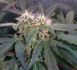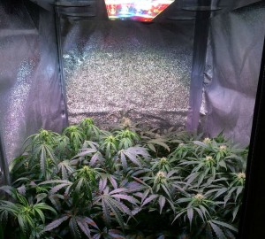 In mijn kleine kweektentje van 60 x 60 centimeter, staan vier autoflower Jack Herer planten. De dames zijn vanaf het moment van ontkiemen 62 dagen oud en ik kweek ze bij wijze van test onder een nieuwe Franse LED-lamp van G-Tools, de X-Max V2. Dat is een krachtige 350 Watt LED lamp waarbij je werkelijk alles kunt instellen qua lichtspectrum. De vier planten lieten twee verschillende fenotypen zien, twee dames waren in het begin wat langer gerekt en de twee andere dames kregen een meer bolvormig uiterlijk zodat ik ze mijn bolchrysanten genoemd heb. Op dag nummer 40 uit het leven van deze planten liet ik per ongeluk een koolstoffilter op een van de dames vallen waardoor die nu nog maar een tak heeft en eigenlijk alleen nog voor spek en bonen in de tent staat. Maar desondanks groeit mijn tent enorm vol, ik denk dat ik het zelfs met 1 plant nog vol had kunnen krijgen.
