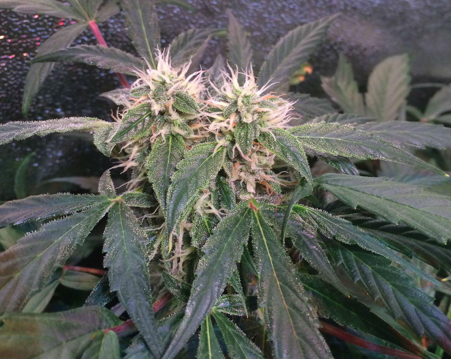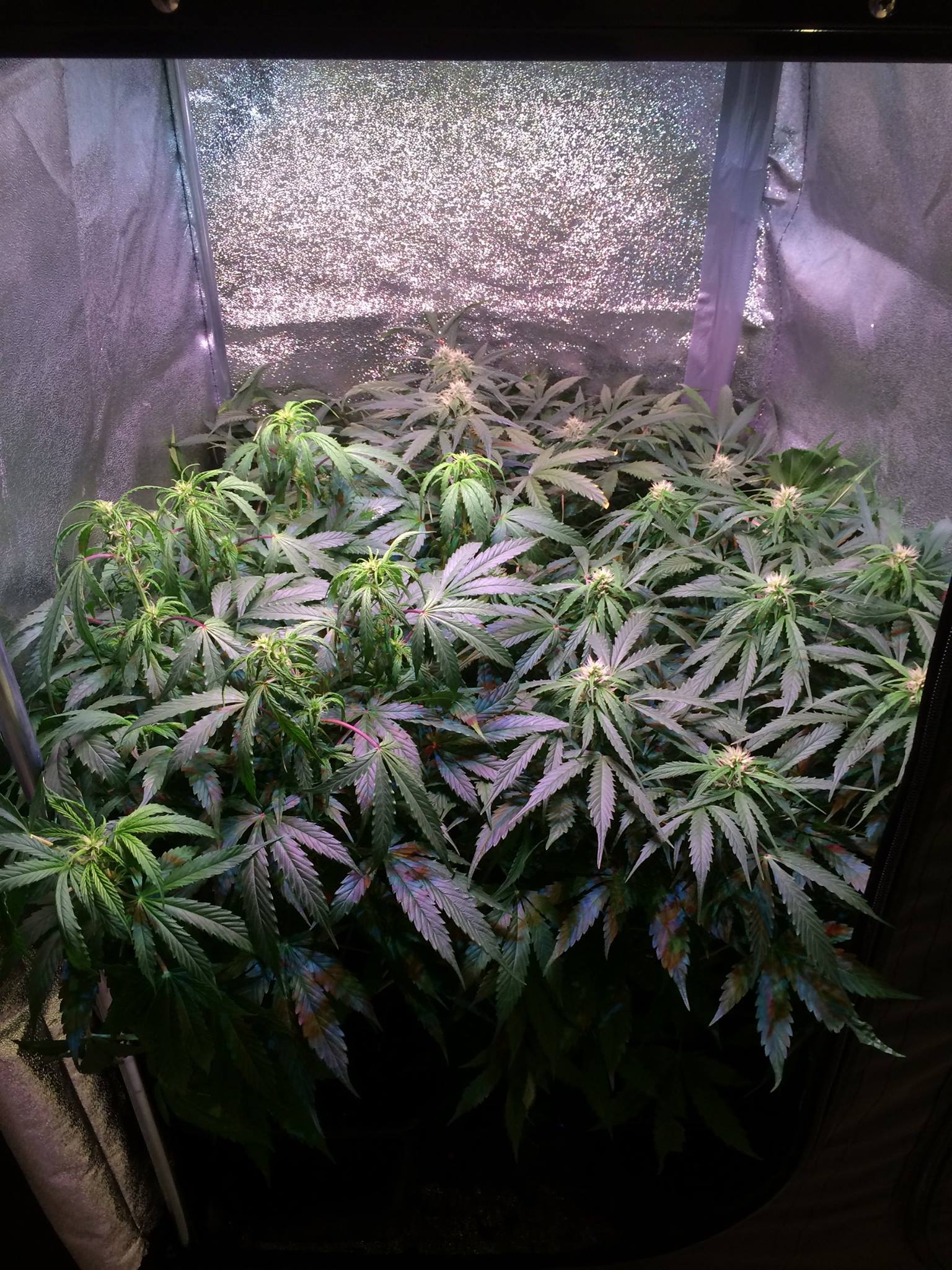 In mijn kleine kweektentje van 60 x 60 centimeter, staan vier autoflower Jack Herer planten. De dames zijn vanaf het moment van ontkiemen 62 dagen oud en ik kweek ze bij wijze van test onder een nieuwe Franse LED-lamp van G-Tools, de X-Max V2. Dat is een krachtige 350 Watt LED lamp waarbij je werkelijk alles kunt instellen qua lichtspectrum. De vier planten lieten twee verschillende fenotypen zien, twee dames waren in het begin wat langer gerekt en de twee andere dames kregen een meer bolvormig uiterlijk zodat ik ze mijn bolchrysanten genoemd heb. Op dag nummer 40 uit het leven van deze planten liet ik per ongeluk een koolstoffilter op een van de dames vallen waardoor die nu nog maar een tak heeft en eigenlijk alleen nog voor spek en bonen in de tent staat. Maar desondanks groeit mijn tent enorm vol, ik denk dat ik het zelfs met 1 plant nog vol had kunnen krijgen.