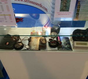Links: De Serious Seeds stand vlak voor de beurs open ging voor de bezoekers. Hostess Sandra spreekt vloeiend Spaans en Frans zodat ze de vele Franse bezoekers ook kon helpen. Irun ligt dicht bij de Franse grens waardoor er, zoals ik eerder zei, veel Franse bezoekers waren. Rechts: Doug (met pet) en Terry (met lang haar) van T.H. Seeds met hun zojuist gewonnen tweede prijs in de categorie beste sativa. Ze kregen de prijs voor S.A.G.E. Verder viel hun Bubble Gum hasj ook in de prijzen en hun Bubble Gum zelf (sativa) trouwens ook. Ze waren met drie prijzen de grote winnaars van de avond.