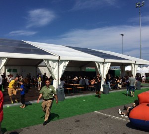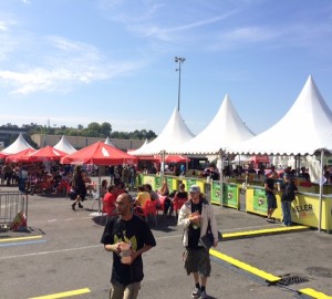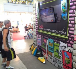 Links: Het buitengedeelte van de beurs waar je wat kon eten en drinken of met allerlei activiteiten kon meedoen zoals surfen of Formule-1 rijden in een van de simulators. Rechts: De stand van het Spaanse Ripper Seeds. De jongen die je ziet staat op een skakeboard deck en rolt (stoned) door een virtuele skatebaan, ik heb het ook geprobeerd, een supervet spel!
