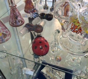 Links: Traditionele Spaanse gerechten in een grote eetgelegenheid op het buitengedeelte van de beurs. Rechts: Een vitrine met spullen van Galls-Company. Zij maken moderne glazen bongs en rigs om mee te dabben. Het lieveheersbeestje op de voorgrond is een grinder. Onder op de foto zie je nog net een prijs die het bedrijf op Spannabis kreeg voor beste (glazen) product.