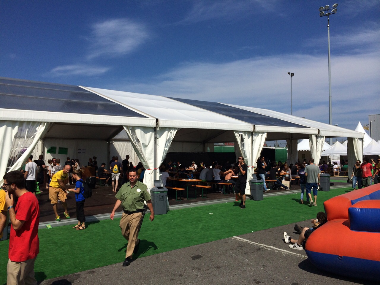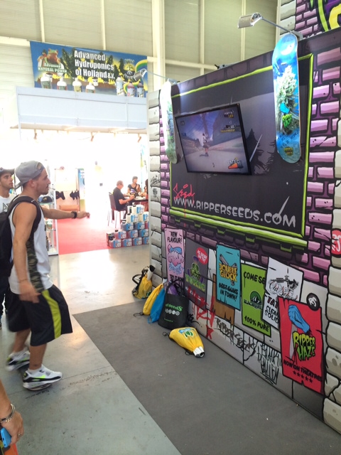 Links: Het buitengedeelte van de beurs waar je wat kon eten en drinken of met allerlei activiteiten kon meedoen zoals surfen of Formule-1 rijden in een van de simulators. Rechts: De stand van het Spaanse Ripper Seeds. De jongen die je ziet staat op een skakeboard deck en rolt (stoned) door een virtuele skatebaan, ik heb het ook geprobeerd, een supervet spel!