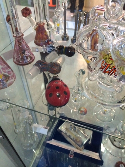 Links: Traditionele Spaanse gerechten in een grote eetgelegenheid op het buitengedeelte van de beurs. Rechts: Een vitrine met spullen van Galls-Company. Zij maken moderne glazen bongs en rigs om mee te dabben. Het lieveheersbeestje op de voorgrond is een grinder. Onder op de foto zie je nog net een prijs die het bedrijf op Spannabis kreeg voor beste (glazen) product.