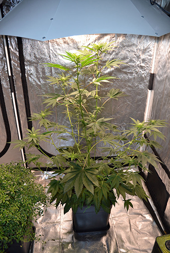Aangezien ik eigenlijk geen plaats had om de Sticky Beast te drogen, heb ik de helft van de 240 tent ingericht als droogkamer. Heel eenvoudig, met enkele dikke zwarte vuilniszakken en plakband. Gewoon een gat in de vuilniszakken voor het koolstoffilter en klaar. In de andere helft staat de Runtz onder de 315 Watt CMH.