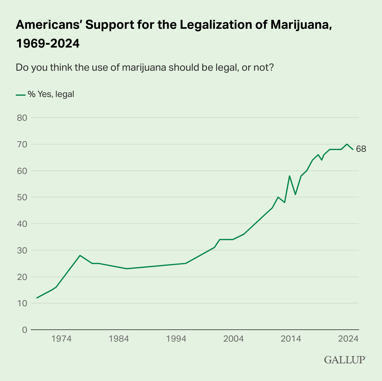 Gallup is de bekendste opiniepeiler van de VS en elke twee jaar onderzoekt men ook hoe het met de populariteit van wiet gesteld is. Inmiddels is medicinale cannabis in driekwart van de 50 staten legaal en recreatieve cannabis in de helft.