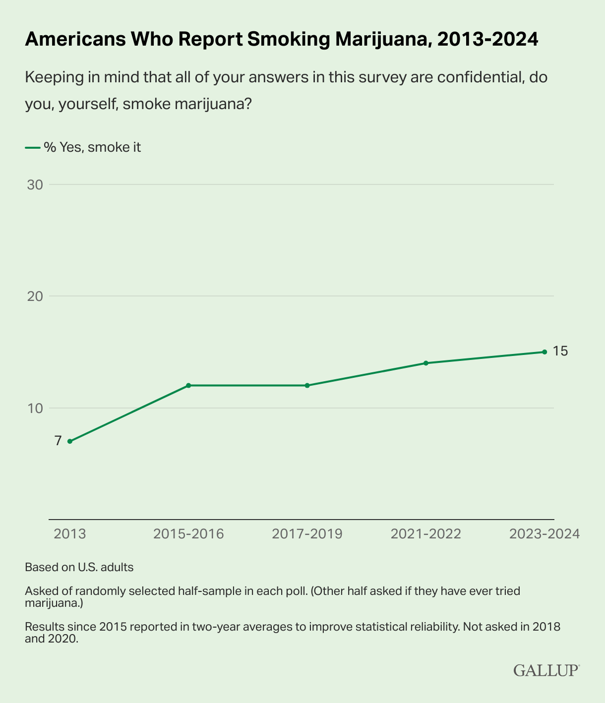 In de Gallup-peiling die 1 november werd vrijgegeven, zegt 15% van de Amerikanen dat ze in 2023/2024 wiet hebben gerookt. Nog maar elf jaar geleden, in 2013, gaf nog slechts 7% van de mensen aan dat ze cannabis gebruikten. Meer dan een verdubbeling dus in een decennium!
