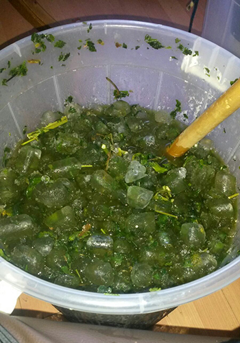 Hier in Schotland gaan we door met roeren en zeven tot we geen hasj meer in de zakken vinden of onze ijsblokjes gesmolten zijn. Smelt het ijs te snel dan doen we er meer ijs bij om de temperatuur opnieuw te verlagen. Een goede tip is om je ijs en je wiet in een emmer te roeren en pas daarna door de bubble bags te gieten. Wanneer je in de zakken zelf gaat roeren, kunnen de zakken scheuren of snel verslijten. Alles bij elkaar heb ik nog eens 12 gram fantastische ice-o-lator hasj aan mijn knipafval overgehouden. Ik veranderde groen in goud, het is zeker de moeite waard om te doen man!