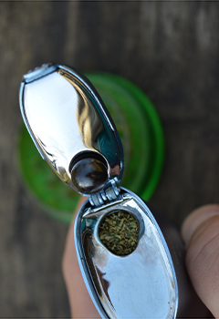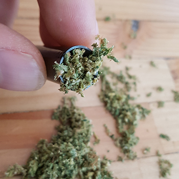 Op de drie foto’s hieronder zie je hoe we de kruidenkamer van de IQ vullen. Dat gaat makkelijk en snel omdat de kruidenkamer door een soort glimmende glijbaan voor wiet wordt omringd. Dit is een convectie verdamper, dus het is wel belangrijk dat je de wiet goed maalt voor je hem vult. Maar je kunt dus simpelweg de klep openen, wiet droppen en in de kruidenkamer laten glijden, a piece of cake!