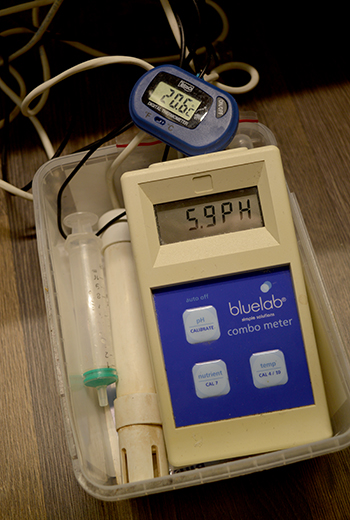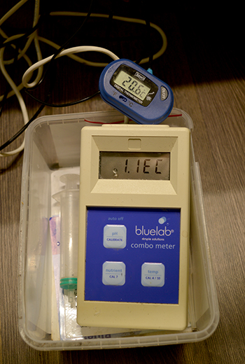Gisteren zijn de plantjes voor het eerst aan mijn kweekkast voorgesteld. De wortels halen het water nog niet dus ik geef de zaailingen nu nog van bovenaf water. Dat pak ik gewoon uit het reservoir eronder trouwens, want dat heb ik wel al gevuld. Voor de zekerheid heb ik ook mijn EC- en pH-meter nog even geijkt, zodat ik zeker weet dat het water de juiste waarden heeft. De EC-waarde was na het toevoegen van de voeding (BioQuant Mineraal Start) 1,1 en de pH-waarde heb ik afgesteld op 5,9. De watertemperatuur was vanmorgen 20,6 graden – perfect!