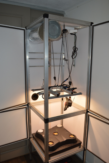 Ik had nog een 150 Watt HPS kweeklamp liggen en een 100 Watt Hans Panel LED, en die heb ik boven de twee planten gehangen. Een oude zwenkventilator op mijn werkbank zorgt voor de luchtverplaatsing, en een extra rolgordijntje houdt de planten (en vooral het licht) uit het zicht van de buren. Een afzuiger met koolstoffilter ophangen vond ik wat overdreven; toen de planten nog buiten stonden waren ze immers ook al te ruiken.