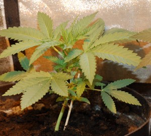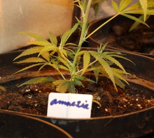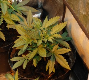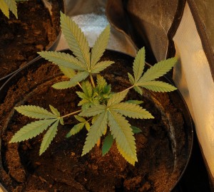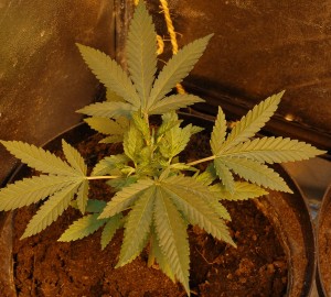 Drie van mijn planten zijn duidelijk wat groter dan de twee anderen en in mijn propagator staan nog een paar baby’s onder Tl-verlichting. Ik ben na het verpotten begonnen met bijvoeden met BioBizz meststoffen. Omdat deze voeding nieuw voor me is houd ik alles nauwlettend in de gaten. Een van de dames vergeelde en stopte met groeien, (zie foto) ik heb haar daarom maar even met rust gelaten. Ik denk dat dat door de voeding kwam en heb toen klassieke muziek van Mozart opgezet om haar er weer bovenop te helpen. En warempel! Na een week kreeg ze weer mooie groene bladeren en begon ze bij te trekken. De volgende drie dagen heb ik haar alleen water gegeven zodat ze goed kon herstellen.