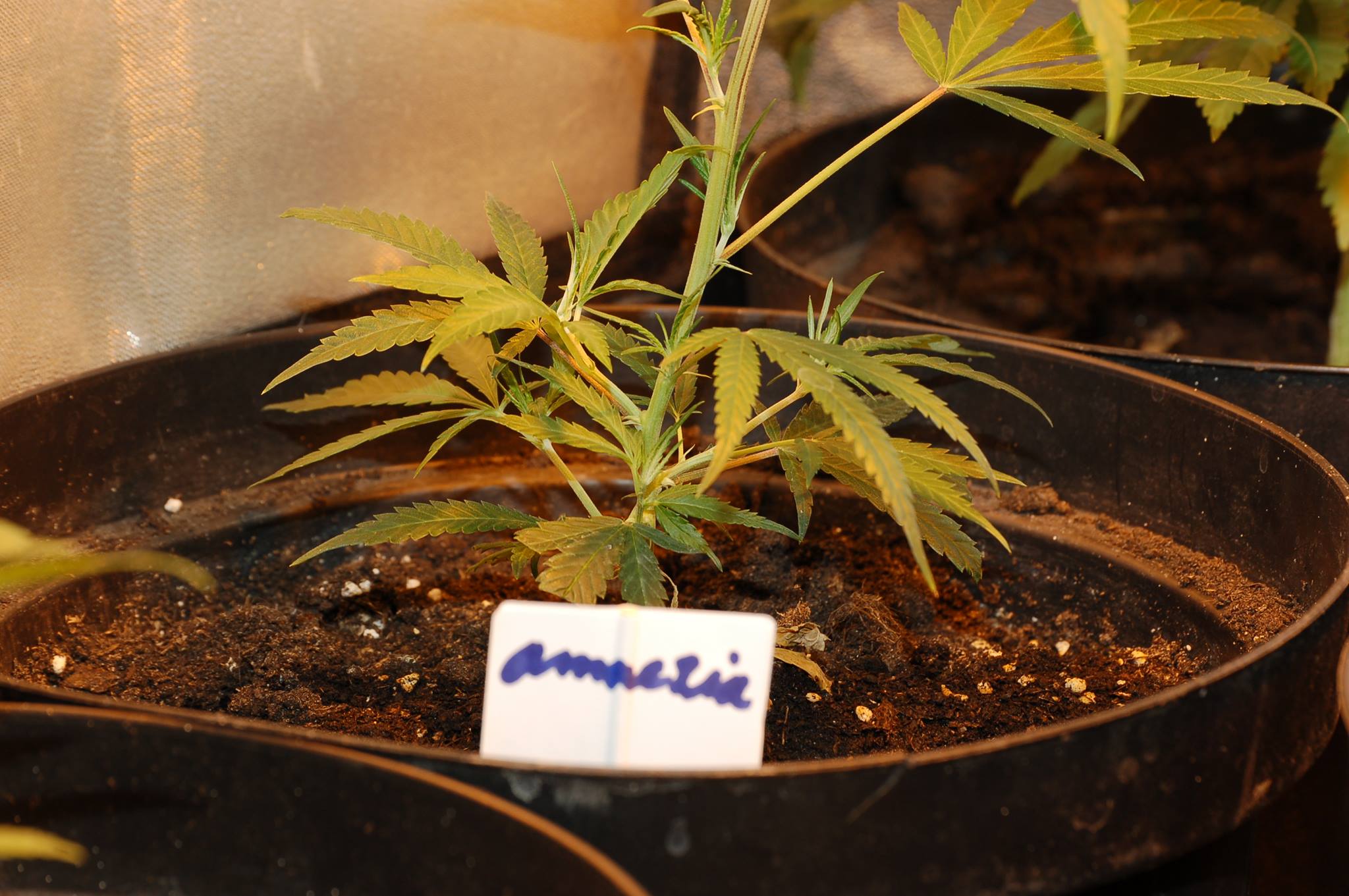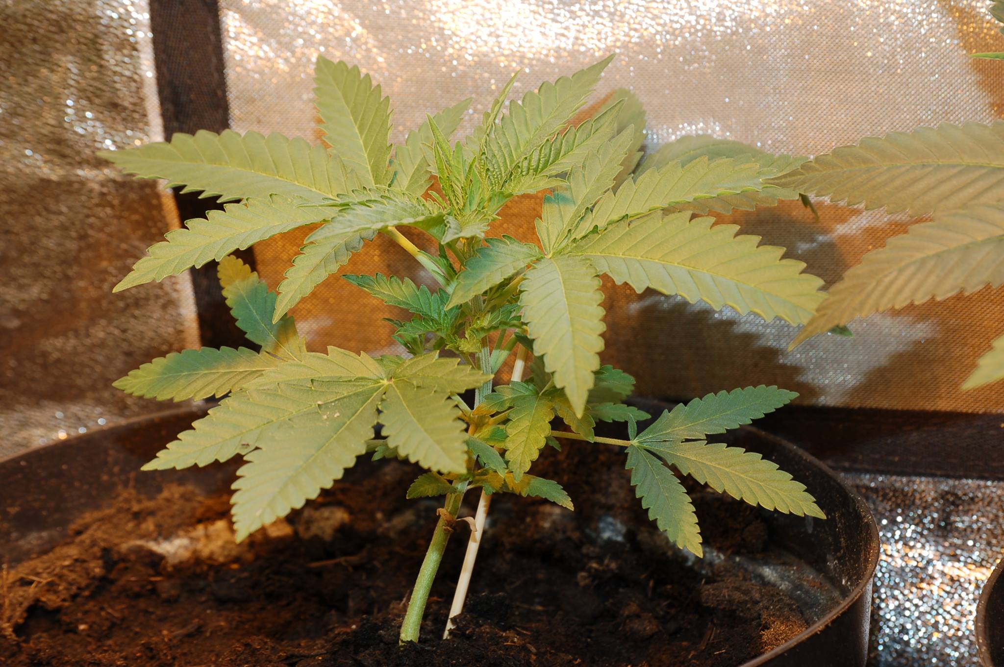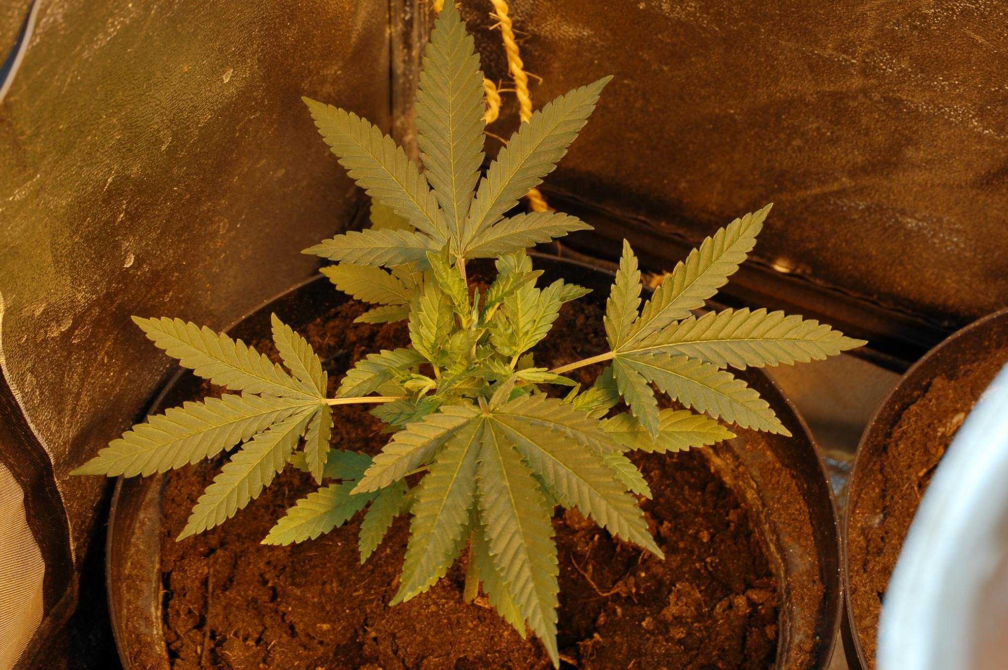 Drie van mijn planten zijn duidelijk wat groter dan de twee anderen en in mijn propagator staan nog een paar baby’s onder Tl-verlichting. Ik ben na het verpotten begonnen met bijvoeden met BioBizz meststoffen. Omdat deze voeding nieuw voor me is houd ik alles nauwlettend in de gaten. Een van de dames vergeelde en stopte met groeien, (zie foto) ik heb haar daarom maar even met rust gelaten. Ik denk dat dat door de voeding kwam en heb toen klassieke muziek van Mozart opgezet om haar er weer bovenop te helpen. En warempel! Na een week kreeg ze weer mooie groene bladeren en begon ze bij te trekken. De volgende drie dagen heb ik haar alleen water gegeven zodat ze goed kon herstellen.