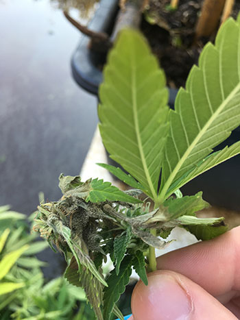 De Mango doet het ook goed, maar toch ontdekte ik bij deze dame iets wat ik niet had verwacht. Toprot! bij inspectie van de plant zag ik onder een schutblad een verdord topje. En verderop nog een, en nog een, en nog wat meer. Omdat het een dikke bossige plant was, en het een paar weken koud en regenachtig is geweest, is de toprot op deze plant neergeslagen. En dus heb ik, na het verwijderen van meerdere rotte toppen, besloten om de Mango te oogsten. Na een avondje knippen had ik een mooi droogrek vol.