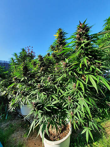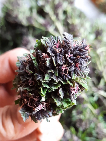 Het weer was goed en de bloemen genoten met volle teugen. Wel heb ik elke dag de weer-app goed in de gaten gehouden, want het kan zomaar omslaan. Net zoals vorig jaar was de Gold Rush Outdoor de eerste van de Spliff Seeds die klaar was om te oogsten. Toen ze de eerste schimmeltjes begon te vertonen, heb ik haar geoogst. Dat was op 16 oktober. Als vanouds heb ik weer dikke toppen geoogst met de Gold Rush outdoor. Het is een goede, stabiele buitensoort. Maar ook heeft deze een lekker aroma. De geuren citrus en limoen zijn duidelijk aan de toppen te ruiken. En bij een kleine pre-smoke was de dieselsmaak al duidelijk aanwezig. Nog even curen dus.