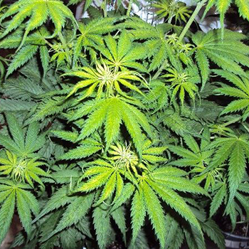 Een kleine scrog met één plant en T5 balken: alle toppen hebben een gelijke afstand tot de lichtbron