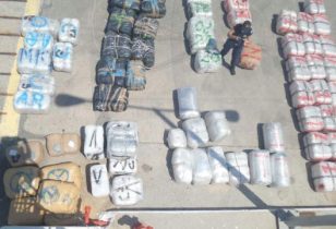 Bewijsfoto van de Griekse kustwacht met de in beslag genomen hasj voor de happy few…
