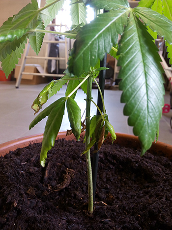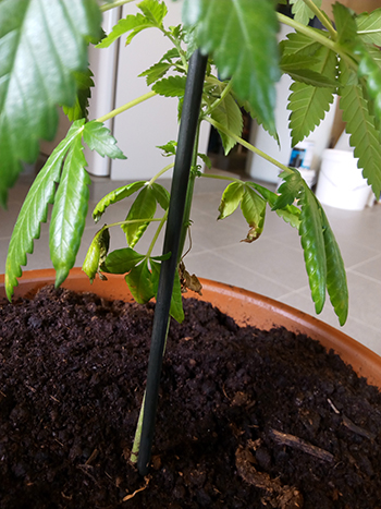 Verder valt op dat het stammetje best dun is en ondersteunt moet worden met een stokje. De ondersteuning houdt de plant weliswaar rechtop maar het zorgt er ook voor dat de stam dun blijft en zich niet goed ontwikkelt. Idealiter zorg je ervoor dat een wietplantje vanaf het begin, naast voldoende licht ook een beetje wind vangt. De wind beweegt het stammetje heen en weer waardoor het sterker en dikker moet worden. Misschien kun je voor deze plant het stokje wat losser aan de plant binden, zodat het nog steeds rechtop wordt gehouden maar wel kan bewegen.