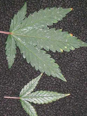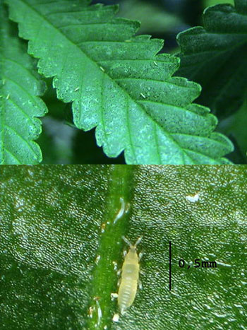 De wietplanten van Kathy krijgen keer op keer last van trips, althans zo lijkt het. Op de schutbladeren ontstaan keer op keer van die zilveren vlekjes, de typische sporen van trips. De opbrengst is daarbij wel gewoon goed te noemen, en wat ook vreemd is dat er geen beestjes te ontdekken zijn. Zelfs niet met een trichoscope…