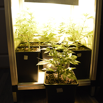 Een voor een heb ik de planten uit de kast genomen en nog eens gekeken of er iets gediefd moest worden. Bij zowat iedere plant heb ik het slechtst ontwikkelde takje weggesnoeid. Vervolgens heb ik alle planten met die zijde tegen de want aangezet, zodat de goede toppen nu allen naar binnen gericht staan. Door kleine plakkertjes op de potten te plakken weet ik altijd hoe ze in de kast gepositioneerd moeten staan. Het resultaat is een prachtig bladerdek met overal waar je kijkt toppen.
