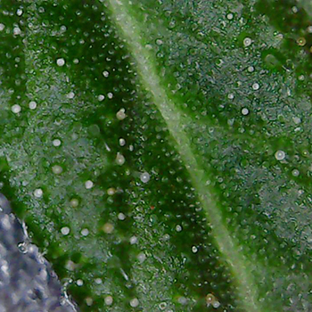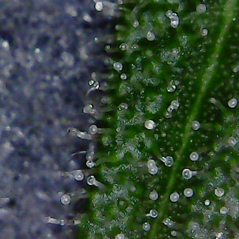 Over trichomen gesproken; die heb ik deze week ook weer even bekeken. Op de linkerfoto hieronder is het suikerblad van top 1 te zien; de meeste kristallen zijn al wit geworden. Op de rechterfoto is een suikerblad van top 2 te zien. Ook hier zijn veel witte trichomen te zien.