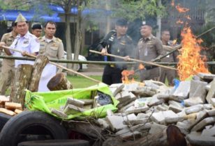 En dat gaat in het openbaar, met de lokale bevolking als toeschouwer, zodat die het wel uit hun hoofd laten om te smokkelen, kweken of verkopen. Met name jongeren worden aangesproken zich verre te houden van wiet. Dinsdag was het weer eens zover in de provincie Nakhon Phanom. Onder leiding van een apetrotse gouverneur Somchai Witdamrong begon het verbrandingsritueel al om 9 uur ’s ochtends.