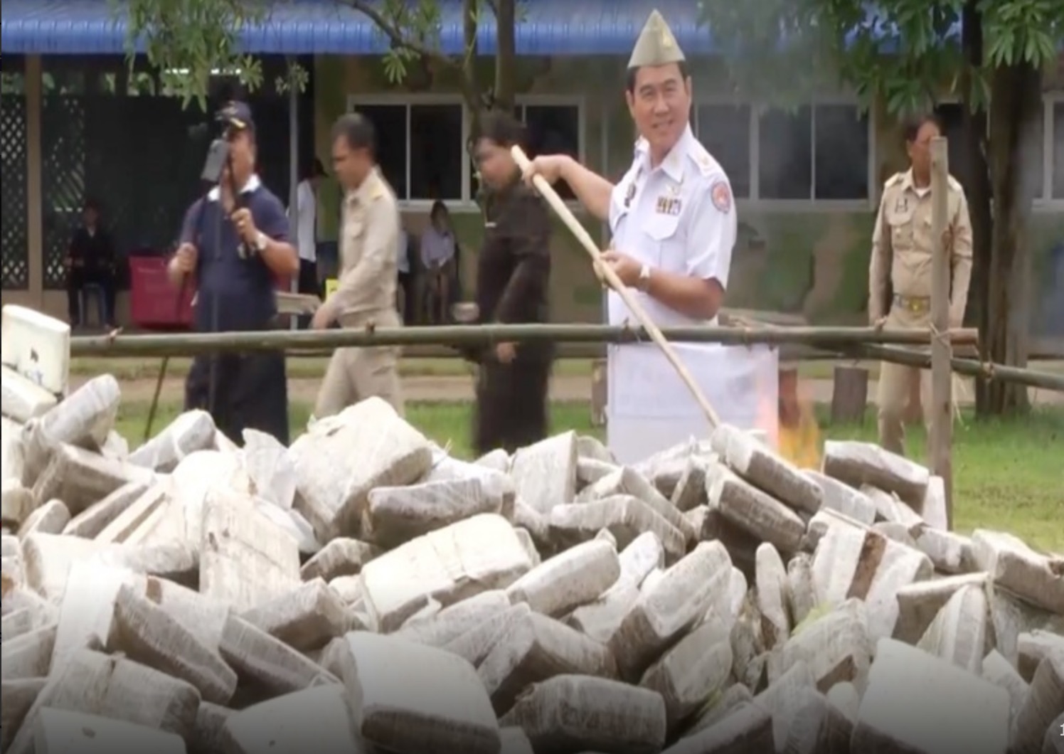 En dat gaat in het openbaar, met de lokale bevolking als toeschouwer, zodat die het wel uit hun hoofd laten om te smokkelen, kweken of verkopen. Met name jongeren worden aangesproken zich verre te houden van wiet. Dinsdag was het weer eens zover in de provincie Nakhon Phanom. Onder leiding van een apetrotse gouverneur Somchai Witdamrong begon het verbrandingsritueel al om 9 uur ’s ochtends.