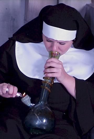 Zuster Ank dacht altijd dat blowen tegen Gods regels inging, maar toen dat reuze bleek mee te vallen (klik) kocht ze meteen een bong. Nu doet zuster Ank niets anders meer dan de hele tijd aan die bong lurken en haar vreetkicks met hosties stillen… Lekker toch!