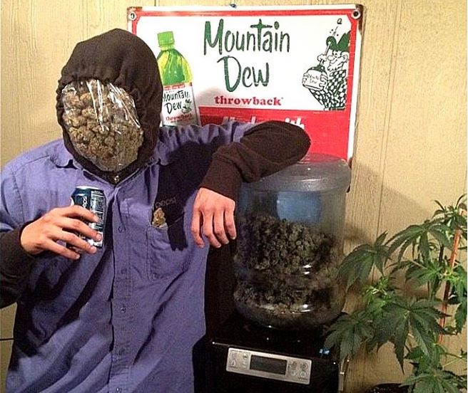 Zoals de meeste blowers is ook Andrew apetrots op zijn oogst, hij wilde alleen zelf even niet in beeld. Tja, en waar kun je je gezicht dan beter mee verbergen dan met je oogst zelf? Over pot heads gesproken…