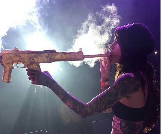 Lola heeft een vredelievende toepassing voor wapens gevonden en rookt haar AK-47 ermee in stijl. Wellicht dat het de nodige cannabisliefhebbers plat legt maar weest gerust; er zullen in ieder geval geen doden vallen want rook is het enige dat nog uit de loop van haar shotgun komt.