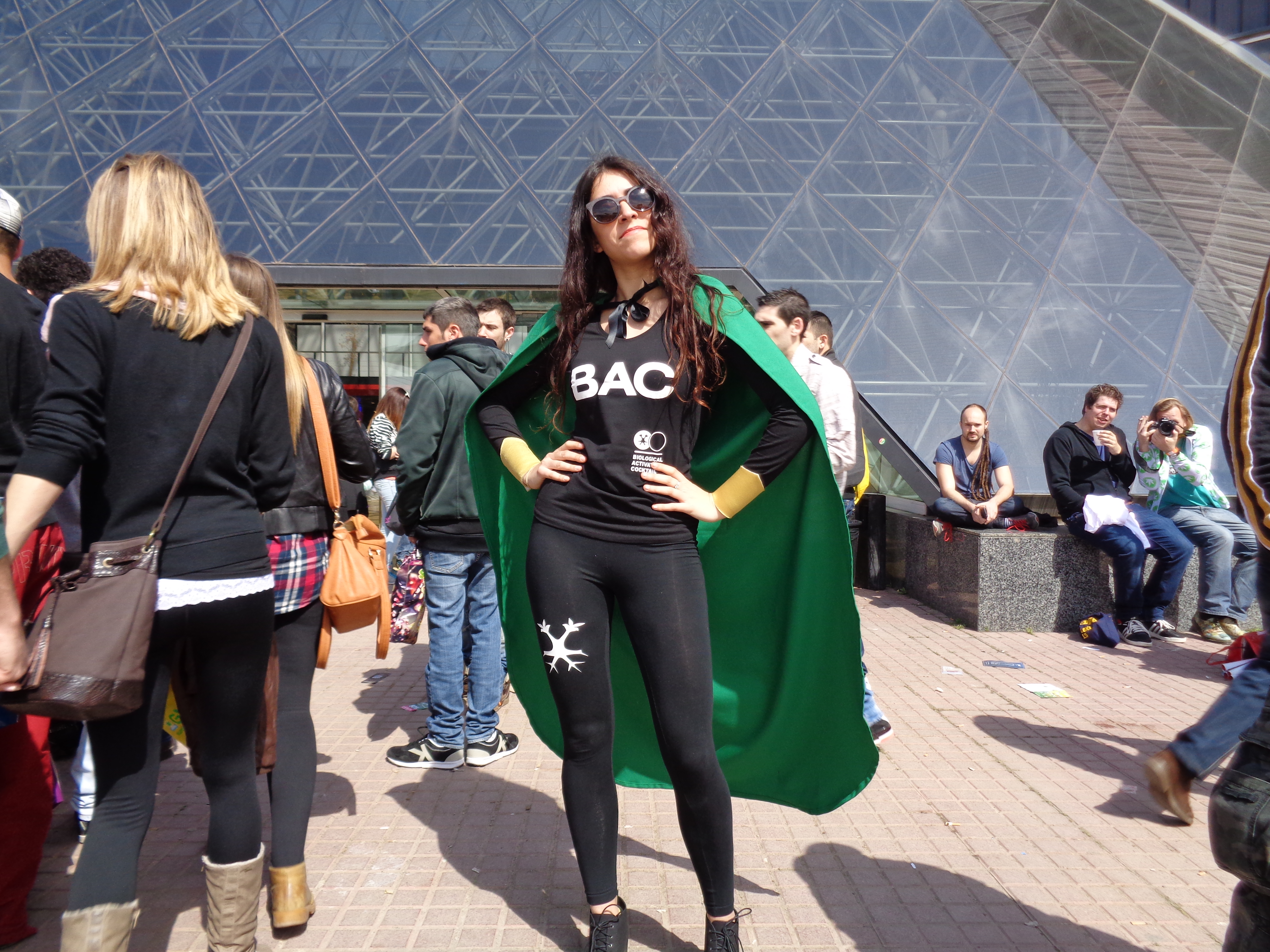 Maak kennis met BAC-woman, een appetijtelijke dame met een grote groene cape die cannabisten in nood helpt waar het maar nodig is. Er is ook een BAC-man maar die hielp op het moment van deze foto toevallig net even een hulpbehoevende blower aan een pakje vloei. Helden!