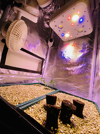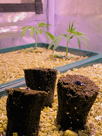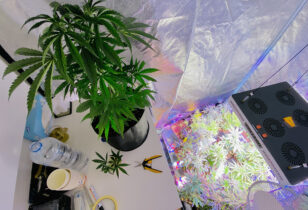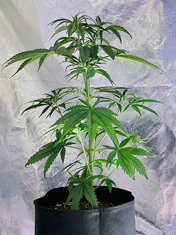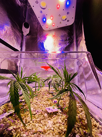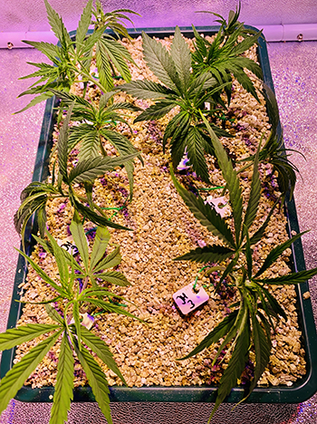 Terwijl de buurman nog met kwetsbare zaailingen in de weer is, staan er hier in de tent louter vrouwelijke exemplaren die inmiddels volwassen genoeg zijn voor de volgende fase van hun leven. Ze mogen zich eindelijk gaan vermenigvuldigen, echter niet op natuurlijke wijze.