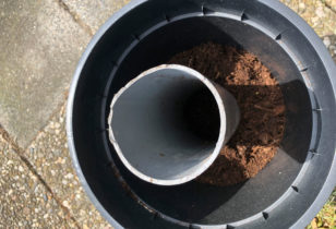 Vervolgens vul ik de pot laag voor laag om de PVC-buis heen. Na elke laag aarde doe ik de aarde weer nat maken en weer een laagje aarde. Op deze manier weet ik zeker dat de aarde op elk niveau vochtig is en staat een vlotte groei de dames niet in de weg. Wanneer de pot helemaal vol is, vul ik de PVC-buis met een Lightmix of kokos. In ieder geval iets wat weinig tot geen voeding bevat. Zo kan de penwortel van de zaailingen zonder al te veel voeding tegen te komen naar beneden groeien.