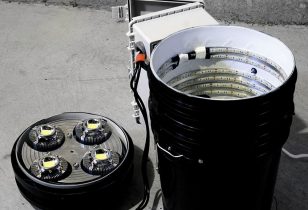 Lekker veel ruimte in deze gestapelde space kratten zoals je ziet, je kunt het met goed fatsoen eigenlijk geen bucket meer noemen maar who cares? De Bucket Tron zoals die heet is aan de binnenkant bekleed met een witte reflecterende folie en led strips. Maar de échte lichtbron is een kant en klare led kweeklamp. De planten kunnen zelfs van afstand worden gemonitord door een Raspberry Pi computer aangesloten op een webcam. En zie je dat Tupperware bakje op de Bucket Tron? Daarin zitten alle elektrische aansluitingen handig weggewerkt.