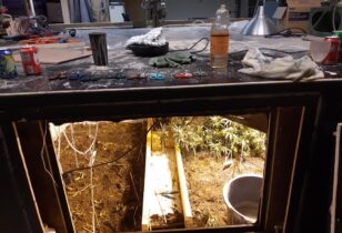 Hoe dan ook, feit is dat de zes (!) gearresteerde verdachten er werk van hadden gemaakt. Letterlijk dus ook, want de groei-en bloei-installatie was verstopt achter een ‘uit de kluiten gewassen werkbank’, zoals de politie het zelf zegt.